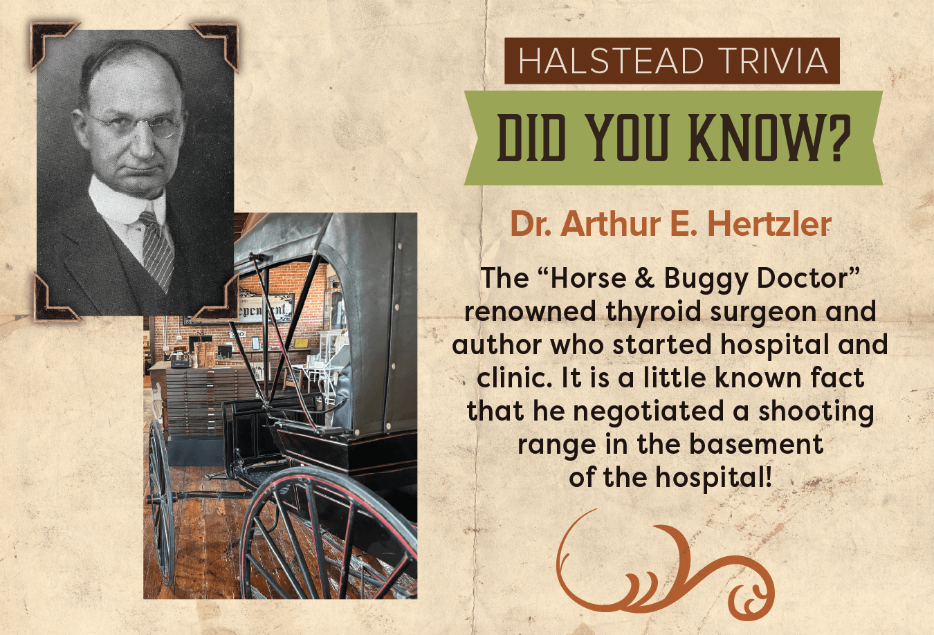 • Display of Dr. A.E. Hertzler, “The Horse & Buggy Doctor,” who began the nationally known Hertzler Clinic & Halstead Hospital, including his medicine cabinet, surgery table, diploma, etc.