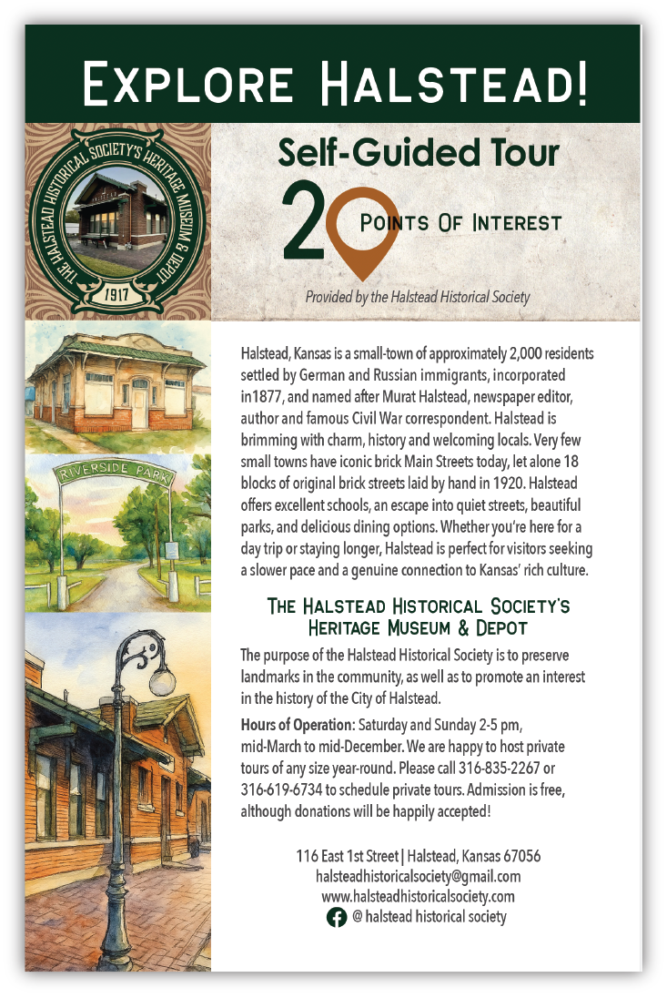 Afterwards, enjoy exploring Halstead with our “Self-Guided Tour” of points of interest in the area! Halstead is a small town brimming with charm, history, and welcoming locals that offers an escape into quiet streets, beautiful parks, and delicious dining options. Whether you’re here for a day trip or staying longer, Halstead is perfect for visitors seeking a slower pace and a genuine connection to Kansas’ rich culture.